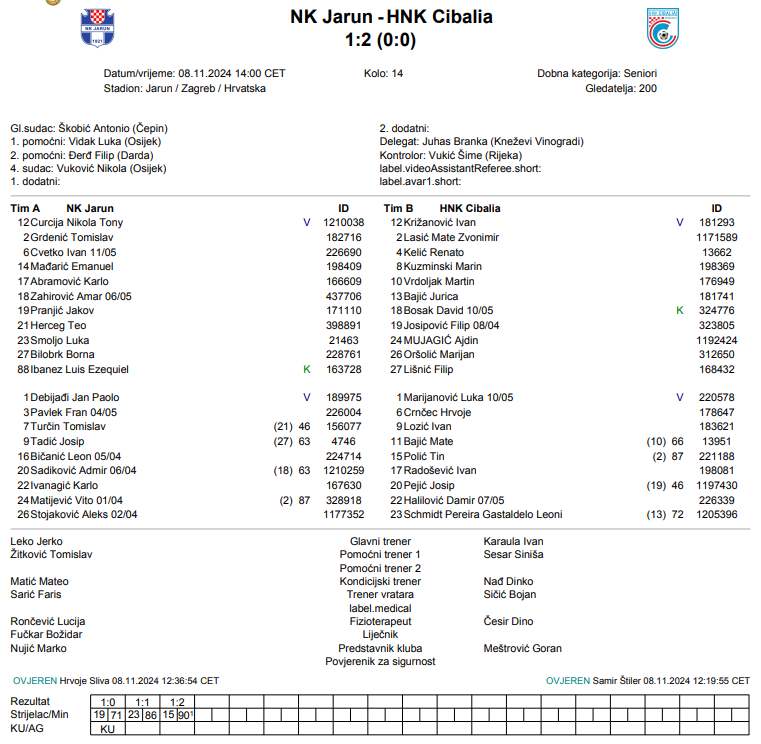 Tko je od tv gledatelja zaspao za vrijeme prvog poluvremena nije baš ništa propustio, Jarun i Cibalia su se pobrinuli za najgorih 45 nogometnih minuta sezone, nadamo se da ih nitko neće nadmašiti. Bilo je to klasičnih ništa – ništa kako se u nogometnom žargonu kaže. Pet minuta drugog poluvremena donijelo je neusporedivo više uzbuđenja nego čitavo prvo poluvrijeme, u tih pet minuta dva puta su ogled imali Mujagić i Curcija, oba puta kao pobjednik je izišao vratar Jaruna. U tom drugom dijelu Cibalia je izgledala bolje, a onda prvi ozbiljniji napad Jaruna, Jakov Pranjić je “uletio” u kazneni prostor, Lasić zakasnio s reakcijom pa je Jarun dobio priliku s bijele točke, jedan klasični penal na koji se nitko do gostiju nije niti pokušao buniti. Jakov Pranjić je zanemario ono nepisano pravilo, namjestio je loptu na “kreč”, poslao Križanovića u jednu, a loptu u drugu stranu. U 79. minuti Curcija još jednom sjajno reagira, bio je to zapravo najbolji potez na utakmici, fantastičnom paradom je iz samog gornjeg lijevog kuta iščupao jedan pokušaj -svog suigrača. Nespretno je Sadiković pokušao očistiti iz svog kaznenog prostora, no mladog je defanzivca spasio sjajni vratar Jaruna pa je Cibalia od svega dobila samo korner. U 88. minuti Cibalia ipak dolazi do izjednačenja, Pejić je ubacio s poludistance, nije to bio neki dobar ubačaj, ali nitko od domaćih to nije očistio, stigla je na drugu vratnicu gdje ju je dočekao Leoni Gastaldelo i sa 3-4 metra pospremio u mrežu. Bio je to samo početak muke za Jarun, u prvoj minuti sudačkog dodatka Cibalia je došla do potpunog preokreta, Kuzminiski je dugom loptom u srcu kaznenog prostora pronašao Oršolića koji majstorski spušta do Tina Polića kojeg je obrana Jaruna potpuno zaboravila, a svježi Polić samo tri minute nakon ulaska u igru poentira za konačnih 1:2