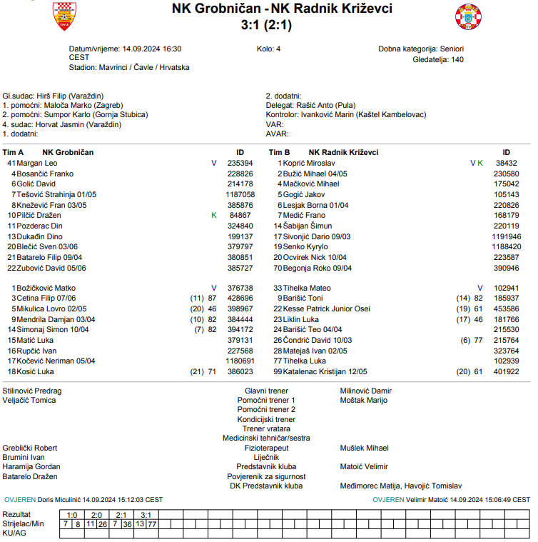 Silno je Grobničan trebao pobjedu nakon lošeg starta u sezonu, protivnik iz Križevaca nije nimalo lak, ali kako je sam Stilinović rekao, nemamo mogućnost birati protivnika. Krenulo je odlično po Crvene, oduzeta lopta na sredini terena, brza lopta na Pilčića koji majstorski poslužuje Strahinju Tešovića koji iskosa pokušava pogoditi suprotni kut, Mihael Mačković pokušao je uklizavanjem spasiti, ali je umjesto toga prevario svog vratara skrenuvši loptu iznad njega. U 26. minuti nova lopta u gostujućoj mreži, najveći dio posla obavio je Filip Batarelo, a majstorski je posao okončao Din Pozderac. Već je Grobničan imao loših iskustava nakon što je imao dva gola prednosti, pa se primljeni gol prije poluvremena sigurno nije svidio nikom od domaćih navijača. U 35. minuti dobili su gosti priliku iz slobodnog udarca na 17 metara točno po sredini gola, topovskim udarcem koji je okrznuo nekoga u živom zidu u strijelce se upisao Frano Medić i utakmica je ponovno bila potpuno neizvjesna. U nastavku rovovska bitka za svaku loptu, bez puno prilika osim nakon prekida, a tako je došao i četvrti gol na utakmici, u 77. minuti nakon kornera kraći fliper pred gostujućim vratima, na kraju je najprisebniji Dino Dukađin koji sa osam metara prizemnim udarcem matira gostujuće vratara i dovodi Grobničan na rub te toliko žaljene pobjede.