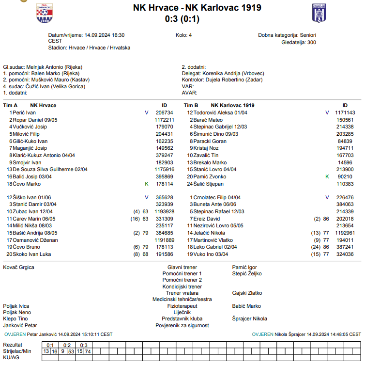 Hrvace su nakon četiri kola možda i najveće razočaranje lige, samo tri boda su na računu, a sjetit ćemo se najava o borbi za sami vrh. Nije to nemoguće, ali morat će neusporedivo bolje od ovoga. Nakon dva poraza Karlovac je vezao dvije pobjede i polako ali sigurno ide u smjeru u kojem se i očekuje, prema vrhu, a ova uvjerljiva pobjeda će biti ogroman impuls Pamićevoj momčadi. Sve dobro u ovoj sezoni kod Karlovca kreće s Markom Brekalom, stasiti napadač bio je i prvi strijelac u Hrvacama, ujedno i jedini u prvom poluvremenu. Početkom drugog poluvremena Kristaj Noz je podebljao vodstvo, a Lovro Stanić u 74. minuti otklanja goste svih briga te postavlja konačnih 0:3.