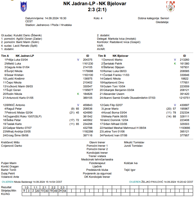 Fantastična nogometna predstava na Jadranovu i nova, četvrta pobjeda Bjelovara na početku sezone! Najteža do sada, ali to se i očekivalo na gostovanju u Pločama, sumnjamo da bi uoči puta netko u Bjelovaru bio nezadovoljan bodom. To zadovoljstvo bodom sigurno se povećalo već nakon tri minute igre kada je Kristian Sesar donio prednost Krstičevićevoj momčadi. U 20. minuti kapetan Patrik Šantalab matira Pršlju i vraća utakmicu u egal, ali nije to baš dugo trajalo, deset minuta trebalo je Jadranu za novo vodstvo, u 30. je pogodio Krešimir Luetić, a tih 2:1 stajalo je na semaforu i na poluvremenu. I drugo je krenulo brzim golom, ovoga puta za Bjelovar, strijelac je Dino Kapitanović. To drugo poravnanje šokiralo je Jadran, Bjelovar je to iskoristio i pet minuta kasnije okrenuo utakmicu na svoju stranu. Onima koji malo redovitije prate Drugu NL bilo bi lako pogoditi tko je strijelac, bio je to Samid Akanni, najbolji strijelac lige kojem je ovo već osmi gol u četiri utakmice.