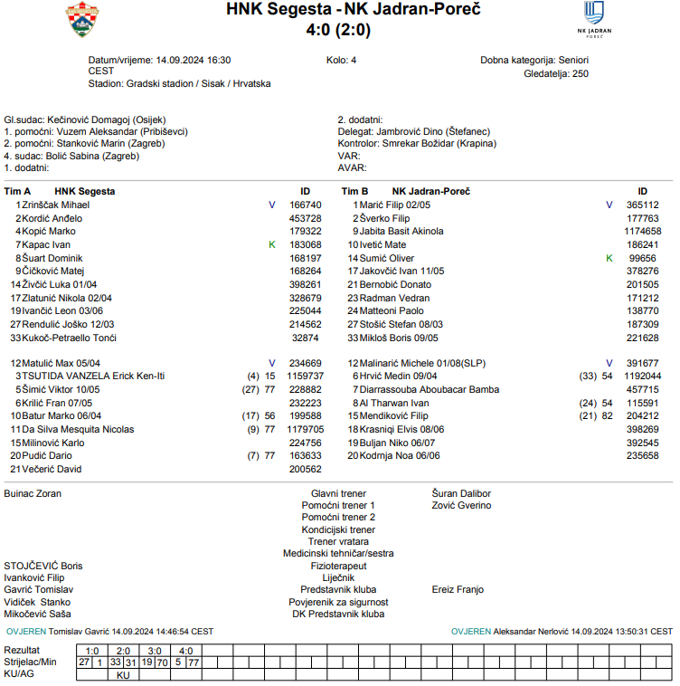 Segesta je došla do vrijedne pobjede, mnogi su bodove unaprijed upisali Siščanima, a zna se često dogoditi da takvi bodovi i izmaknu. Otvaranje nije moglo biti bolje za Buinčevu momčad, već nakon40ak sekundi imali su prednost, kod jednog prekida gostujuća je obrana loše reagirala, na kraju je loptu preko crte ugurao Joško Rendulić. U 24. minuti kazneni udarac za Segestu, u pokušaju da klizećim startom blokira ubačaj Vedran Radman igra rukom, ili bolje reći lopta ga pogađa u ruku, pa je Tonći Kukoč dobio prigodu s bijele točke, no njegov prizemni udarac sjajno brani vratar gostiju, dobio je Kukoč priliku nakon odbijene lopte, no još jednom je Marić na vrhuncu zadatka. Četiri minute kasnije novi penal ja Segestu, Kukoč ga je sada sam i izborio, te protivno pričama o tome da ga ne treba izvoditi onaj na kome je bio, ovaj put pogađa i Siščani su na +2. Sasvim zasluženih s obzirom na prikazano na terenu. Da stvari budu do kraja loše po goste pobrinuo se Filip Šverko koji je u 31. zaradio prvi, a u 34. i drugi žuti karton pa su Porečani ostali s igračem manje, a sebi je pri izlasku s terena ponašanjem sigurno zaradio i dodatnu utakmicu kazne pa će dva tjedna samo trenirati. U nastavku moramo istaknuti 60. minutu, slobodni udarac za Segestu na 17 metara od gola, Kukoč je sjajno izveo slobodnjak, prebacio je zid, išla je lopta u sami gornji desni Marićev kut, ali je mladi vratar Jadrana čudesnom paradom odbio loptu u korner. Četiri minute kasnije Segesta je zabila, no iz zaleđa, minimalnog ali ipak postojećeg. U 69. minuti novi slobodnjak za domaćina na rubu kaznenog prostora, možda metar ili dva dalje nego u prethodnoj situaciji, svi su očekivali novi pokušaj Kukoča koji je ipak prepustio loptu mladom Leonu Ivančiću koji zabija golčinu kakva se ne viđa često. Ima neka veza između njega i grede, u prošlom kolu ju je dva puta pogodio, sada mu se smilovala, od nje se lopta odbila u pod, pa još jednom u vrh mreže, niti sjajni Marić ovaj put nije imao nikakve šanse! U 78. minuti novi pogodak Segeste, zaspala je gostujuća obrana kod kornera, na pet metara sam je bio Viktor Šimić, nije mu bilo teško pogoditi glavom za velikih 4:0.