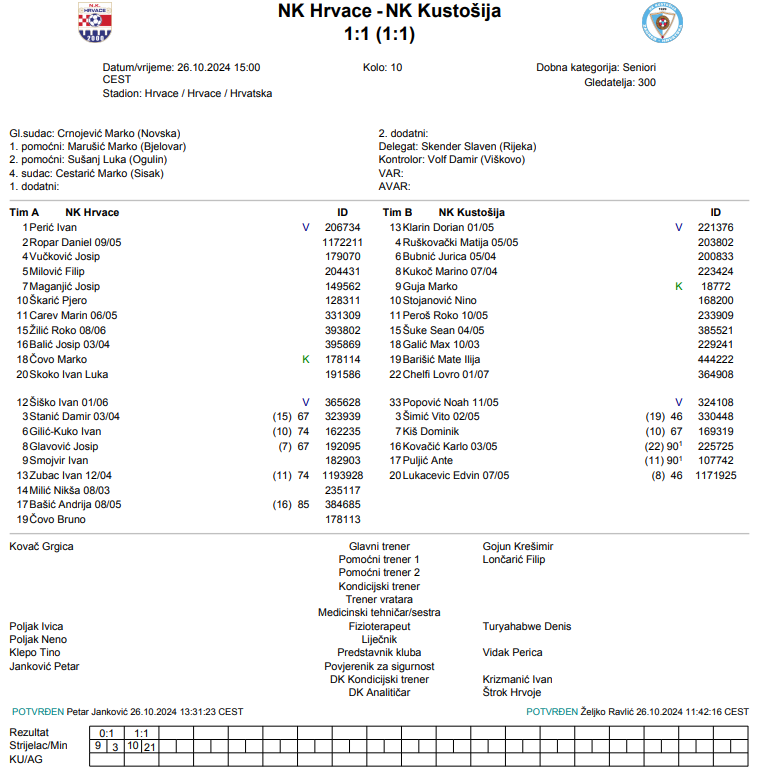 Nakon Mladosti Kustošija je drugi najučinkovitiji gost lige, no niti njima nije pošlo za rukom odnesti sva tri boda iz Hrvaca. Kovačeva momčad je u odličnom ritmu, marljivo skupljaju bodove, ali ipak im nedostaju dvije vezane pobjede da se lansiraju u gornji dom Druge NL. Utakmica je bila prilično intenzivna, i igrački i atmosferom, na kraju dosta povika na suđenje iz Hrvaca, ali se i jedni i drugi moraju zadovoljiti po bodom. Marko Guja je već u trećoj minuti donio prednost Kustošiji, no Hrvace su se na vrijeme vratile, u 21. poravnanje, ali i bod domaćinu donosi Pjero Škarić.