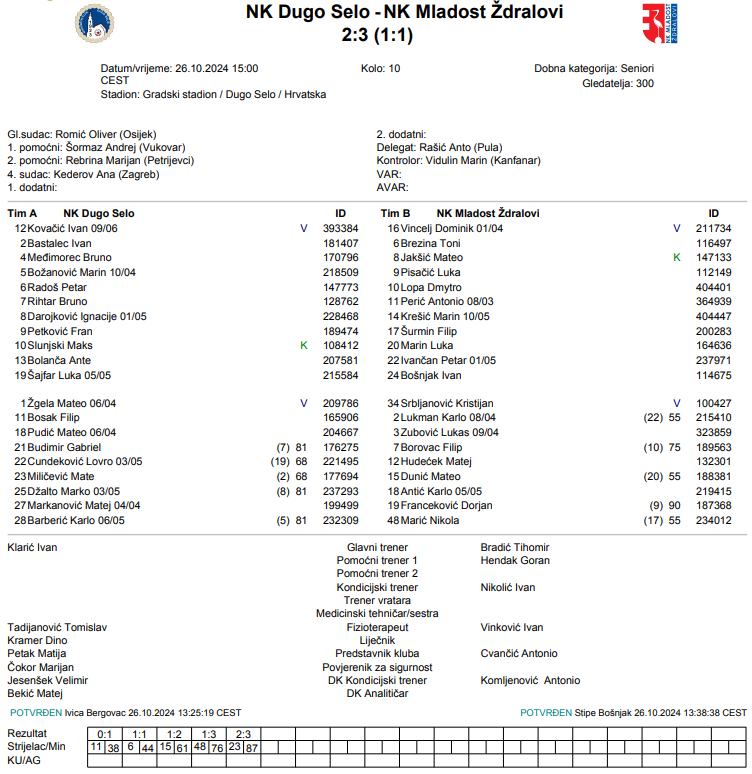 Odlična nogometna predstava u Dugom Selu i odlične vijesti za navijače Mladosti uoči povijesnog ogleda s Hajdukom u osmini finala Hrvatskog nogometnog kupa koji se igra sljedeću srijedu u Bjelovaru. Odlična vijest za njih je svakako pobjeda Mladosti protiv odličnog protivnika i povratak na vrh prvenstvene ljestvice, a vjerojatno i još bolja je da je travnjak na stadionu Brdo otišao u povijest te na njemu više neće igrati ove godine. Da su u domaćim utakmicama bili i približno dobri kao u gostima sada bi imali ogromnu prednost na vrhu. Peto gostovanje i peta pobjeda Mladosti, zaista raritetno ostvarenje za ovako izjednačeno natjecanje. Dugom Selu ostaje dobar dojam, na njihovu žalost on se nigdje pretjerano ne vrednuje. Antonio Perić donio je prednost gostima u 38. minuti, no na odmor se otišlo u egalu za što se pobrinuo Petar Radoš u 44. minuti. U nastavku Mateo Dunić donosi novu prednost Mladosti, dok je Nikola Marić u 76. povećao na 1:3. Snaga Mladosti najbolje se oslikava u ovom dvojcu strijelaca, Bradić ima luksuz imati takve igrače na klupi! Mate Miličević uspio je u 87. vratiti Dugo Selo u utakmicu, no više od dolaska na -1 Klarićeva momčad nije uspjela.