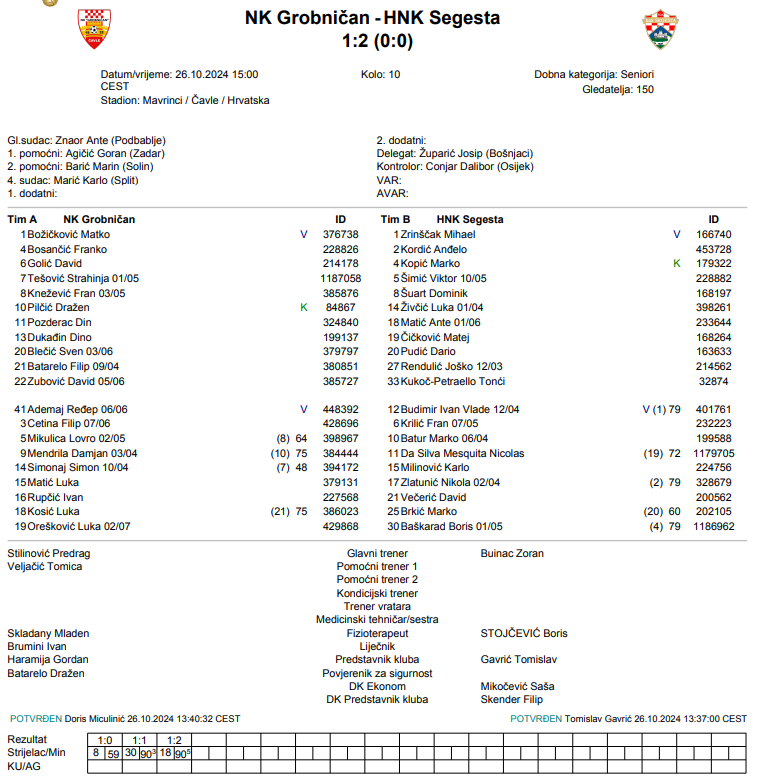 Kakva luda završnica na Grobniku i još jednom poraz Grobničana nakon što je bio u prednosti, ovoga puta u posebno dramatičnom raspletu. Fran Knežević donio je prednost Stilinovićevoj momčadi u 59. minuti, sve je vodilo prema slavlju domaćina, no Segesta se nije predavala, odigrala je do kraja, borili su se do zadnje lopte i dočekali nevjerojatnu nagradu. U trećoj minuti sudačkog dodatka Boris Baškarad pogodio je za poravnanje, a onda u 90+5 Ante Matić zabija i za potpuni preokret! Segesta se vratila, ne samo u ovoj utakmici nego i u globalu, ona mini kriza je preboljena, s dva gostovanja u Sisak su stigla četiri boda i stvari ponovno izgledaju lijepo za Crvene. S druge strane za Grobničan su sve samo ne ugodne, igre na domaćem terenu nisu niti blizu očekivane razine, kako sada stvari stoje njih ponovno čeka žestoka borba za ostanak.