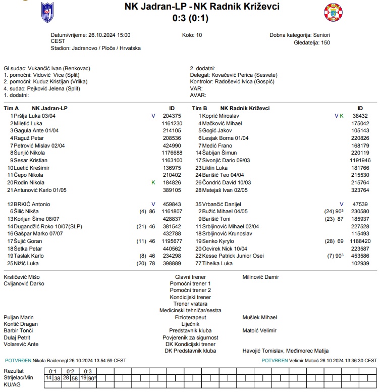 Malo tko je očekivao ovakav ishod u Pločama, Jadran je od svog Jadranova napravio pravu utvrdu, tu se bodovi teško osvajaju već godinama, ali Radnik je došao odigrati mušku utakmicu i potpuno je zasluženo odnio sva tri boda i to na jedan vrlo dojmljiv način. Najbolji pojedinac utakmice Šimun Šabijan u završnici prvog dijela donio je prednost Radniku, a kada je početkom nastavka Ivan Matejaš podebljao vodstvo dalo se naslutiti da bi bodovi mogli put Križevaca. Pokušavao se Jadran vratiti, ali su gosti bili zaista odlično raspoloženi, pa ne samo da su sačuvali prednost nego su u sudačkom dodatku još jednom matirali Luku Pršlju, učinio je to Kyrylo Senko koji je tako postavio konačnih 0:3 za prvu gostujuću pobjedu Milinovićeve momčadi.