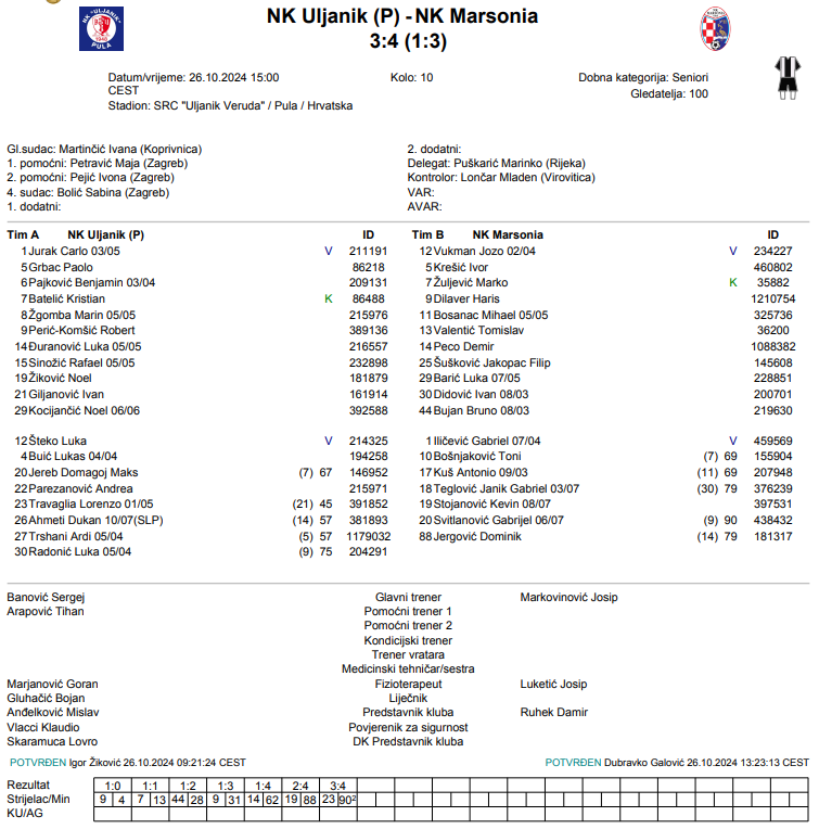Šest u gostima i četiri kod kuće, to je bodovni učinak Marsonije u dosadašnjem dijelu sezone koja se odlično nastavlja na prošlu. Činjenica da Marsonia i domaće utakmice igra na gostujućem travnjaku nije nekakvo suvislo objašnjenje jer su na Livadi već dovoljno dugo da se udomaće, uvijek imaju lijepu podršku s tribina, pa razloge poraznog učinka na domaćem terenu treba tražiti negdje drugdje. Kako bilo, dva pozitivna rezultata u nizu sigurno dižu Bijelo crne, posebno naravno ovo slavlje u Puli. Uljaniku je ovo već treći poraz na Verudi, domaće utakmice su nešto gdje moraju napraviti iskorak i tu redovito skupljati bodove kako se ne bi doveli u borbu za ostanak. Utakmica je bila sjajna za gledatelje, ne može biti drugačije kad vidite sedam golova! Za domaće je dobro počelo, za goste dobro završilo. Već u četvrtoj minuti Robert Perić Komšić je razveselio domaće navijače, ali na odmor se odlazi s uvjerljivom prednosti Marsonije. Preokret je započeo kapetan Marko Žuljević, a do odmora su domaću mrežu pogodili i Bruno Bujan te Haris Dilaver. Kada je u 62. Demir Peco zabio za 1:4 činilo se daj je priči kraj, no opuštanje gostiju Uljanik je umalo kaznio. U 88. Noel Žiković smanjuje, zatim u drugoj minuti sudačkog dodatka pogađa i Lorenzo Travaglia dovodi domaće na -1, a srećom po Marsoniju kraj je došao dovoljno brzo da ne prospu dva boda na nevjerojatan način.