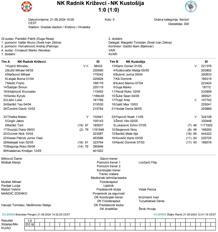 “Dosta dobra utakmica, Kustošija je bolje ušla ali smo mi u petoj minuti imali šansu koja nije ušla, druga je. Sve je nakon tog uvoda bilo izjednačeno, ali bez šansi. Na kraju mi dvije, Kustošija jednu, mi smo jednu i iskoristili i zasluženo pobijedili. Utakmica maksimalno fer s obje strane, suđenje na visokoj razini, ponašanje svih vrhunsko. Na mišiće smo dobili!” – rekao je trener Radnika, Damir Milinović.