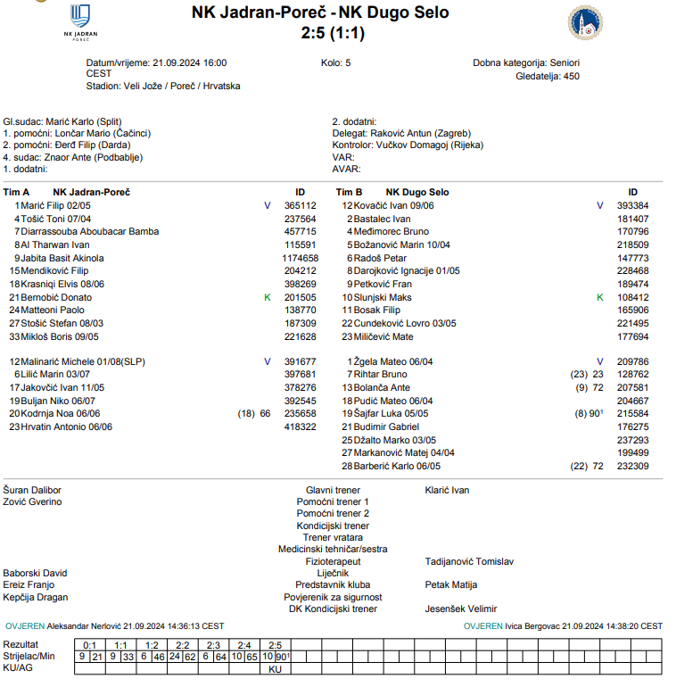 Ponovno je bilo uzbuđenja u Poreču i na terenu i pored njega, a u konačnici s Velog Jože sva tri boda putuju u Dugo Selo. Poveli su gosti u 21. minuti golom Frana Petkovića, a na odmor se otišlo u egalu zahvaljujući Jabiti Akinoli. Nije se pošteno ni krenulo u nastavak a Dugo Selo je opet u plusu, u 46. minuti strijelac je Petar Radoš, nakon toga je uslijedilo malo zatišje, a onda 10 vatrenih minuta, u 62. novo poravnanje Jadranu donosi Paolo Mattoni, no samo dvije minute kasnije ponovno je na sceni Radoš koji donosi i treće vodstvo Dugom Selu, a samo minutu kasnije gosti su na +2 zahvaljujući Maksu Slunjskom. U 70. minuti slijedi poveća gužva i koškanje, isključenja su zaradili pomoćni trener Jadrana Gverino Zović i fizio gostiju Tomislav Tadijanović, dok su požutila oba trenera Dalibor Šuran i Ivan Klarić, u oba slučaja zbog međusobnog naguravanja, očito su treneri ipak ostali u granicama koliko toliko dopuštenog. Kada je već bilo prilično jasno da bodovi idu gostima, u prvoj minuti sudačkog dodatka točku na i ove utakmice stavio je kapetan Dugog Sela Maks Slunjski koji je s bijele točke postavio konačni rezultat.