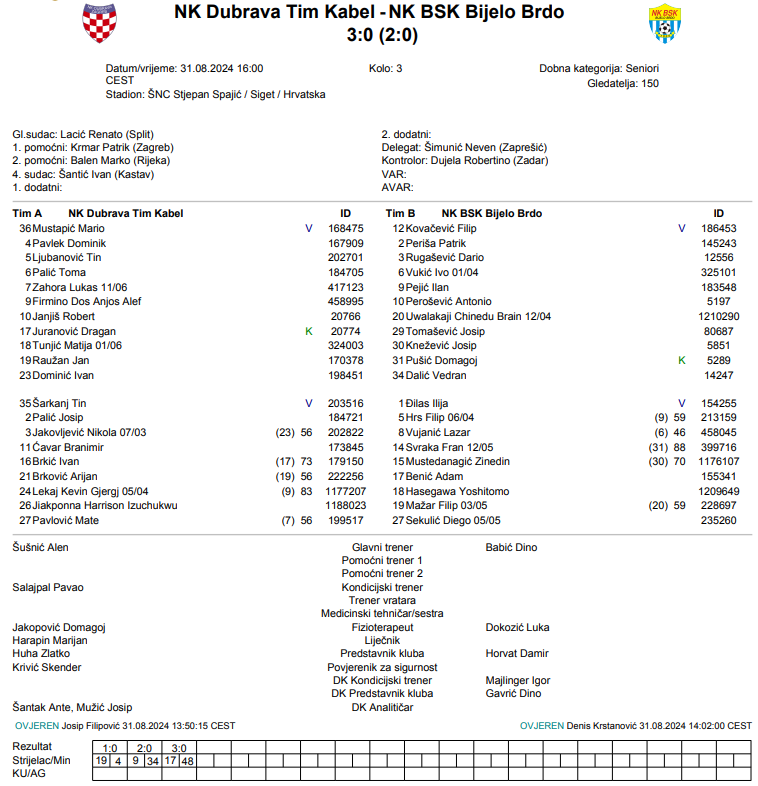 Start utakmice kao u najljepšim željama Alena Šušnića, Zahora je probio lijevu stranu, povratnom našao Juranovića koji je tukao prizemno, vratar gostiju je dobro obranio, ali na odbijenoj loptu su dva igrača Dubrave, Firmino i Raužan, ovaj drugi je najbrži i Dubrava je došla do ranog vodstva već u četvrtoj minuti. Dubrava je prednost povećala u 34. minuti, ponovno su u naslovnim ulogama Raužan i Firmino, sada je prvi asistent, a potonji strijelac, ponovno u suradnji s desnom gostujućom vratnicom. Na odmor je Dubrava otišla s dva gola prednosti, potpuno zasluženo, svoje su prilike iskoristili, a gosti se ne mogu žaliti na realizaciju, prigoda jednostavno nisu ni imali. Kao i u prvo, i u drugo Dubrava kreće savršeno, novim golom koji je praktično “ubio” utakmicu, nije se nazirao način kako se gosti mogu vratiti. Jedna izgubljena lopta u iznošenju je stigla do Dragana Juranovića, kapetan Dubrave nije puno čekao, namjestio se i sa 20 metara prizemnim udarcem odveo Ljubičaste do velikih 3:0. Bio je to i trenutak kada je utakmica praktično završena, ako su gosti i imali kakvu nadu kad su izašli s odmora, tada se po njihovom govoru tijela dalo zaključiti da ne gaje nade da mogu nešto napraviti. Dubrava je upisala treću uzastopnu pobjedu na startu sezone, treću uzastopnu i protiv BSK-a.