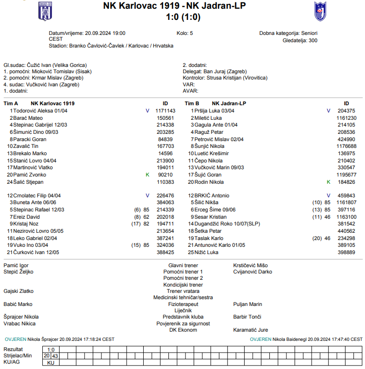 Nakon ne baš sjajnog starta Igor Pamić je posložio svoje trupe, upisana je treća uzastopna pobjeda i eto Karlovca na drugom mjestu Druge NL, doduše vjerojatno neće dugo biti na njemu, ali tu su, blizu vrhu, ponovno u krugu kandidata za promociju u viši rang. Pobjedu protiv Ploča su izborili teškom mukom, no to se i očekivalo, Jadran je isto tako ekipa koja pripada vrhu, ali je sada nakon ovog poraza u lošoj seriji, ovo je treće kolo bez pobjede za Krstičevićevu momčad. Trenutak odluke na Čavleku se dogodio u 43. minuti kada je Mateo Barać izborio, a Zvonko Pamić realizirao kazneni udarac. Pokazalo se to jedinim golom na utakmici iako je lijepih prigoda bilo na obje strane, nešto više ipak pred gostujućim “portirom” Lukom Pršljom.