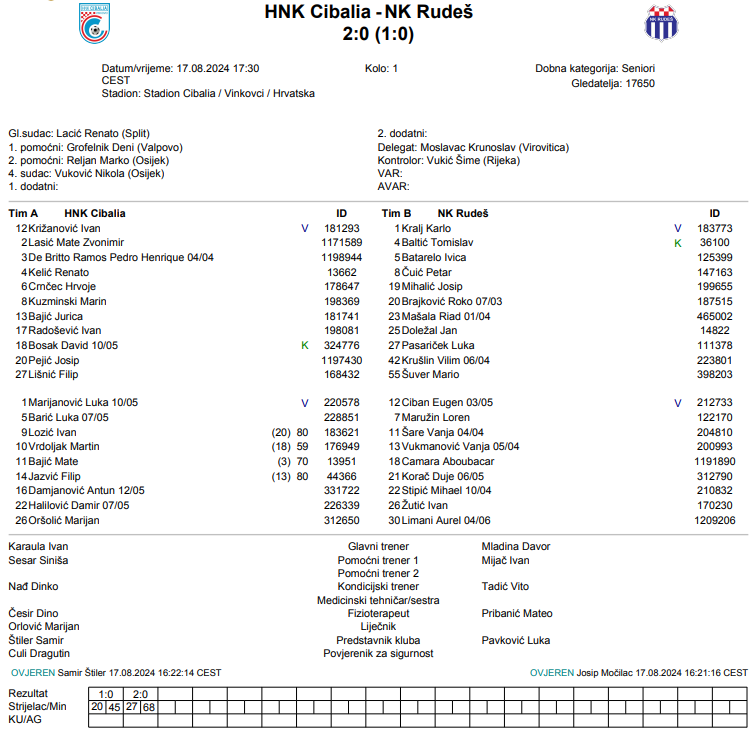 Vrijedna pobjeda Cibalije za početak nove sezone! Rudeš je stigao kao favorit u Vinkovce iako su sve momčadi u startu golema nepoznanica, postavila se Mladinina ekipa tako, nadigrala je Cibaliju u uvodnih pola sata, no put do mreže pored sjajnog Križanovića nije pronašla. Vratar Cibalije imao je dvije sjajne obrane u prvom dijelu, kad je bilo teško spasio je svoju momčad, a onda su i suigrači ugradili svoj dio u pobjedu, nakon tih pola sata uslijedilo je 15 minuta odlične igre Nebeskoplavih za što su nakon nekoliko dobrih situacija nagrađeni i vodstvom. Bila je to posljednja minuta prvog dijela, slobodni udarac na 25 metara od Kraljevog gola, i potez za pamćenje Josipa Pejića, podsjetio je na legendarnog Šlajfu, smjestio je loptu preko zida u sam gornji desni vratarev kut. Neobranjivo! Pokušali su gosti u nastavku vratiti se, no Cibalia im nije puno toga dopustila, dapače, još jednom Josip Pejić iz slobodnjaka radi probleme, Kralj ovaj put nije dobro reagirao, odbio je loptu na kojoj je najbrži Filip Lišnić i Cibalia u 68. minuti ima 2:0. S obzirom na ono što je Cibalia prikazivala – nedostižnih 2:0. Ta se konstatacija pokazala točnom, bez previše problema Cibalia je do kraja sačuvala svoju mrežu i zasluženo došla do prva tri boda.