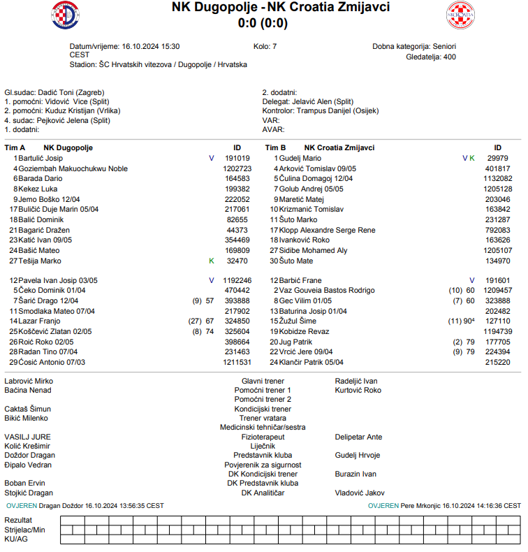 Posljednjih 15ak minuta gosti su igrali s igračem manje, Rene Klopp je u 20. minuti zaradio žuti za prigovor, a u 77. za simuliranje. Ni igrač više nije pomogao Dugopolju da slomi gostujuću obranu, Croatia nastavlja s odličnim rezultatima, posljednji poraz Zmijavčani su doživjeli početkom rujna na gostovanju kod Rudeša, nakon toga marljivo skupljaju bodove u ritmu tri doma, jedan u gostima. Dugopolje se ne može pohvaliti tako dobrim ritmom, njihova posljednja pobjeda datirana je na 18. rujna, dakle mjesec dana nisu slavili, ali barem i ne gube olako, bod po bod…