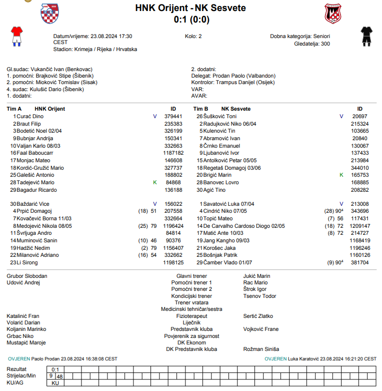 Više od 30 stupnjeva celzijevih dočekalo je nogometaše Orijenta i Sesveta, nešto vjetra ipak je davalo koliko toliko osvježenja, no bilo je vrlo teško igračima obje momčadi pružiti nekakvu veliku igru. Na prvo uzbuđenje čekalo se do 11. minute kada je Bubnjar sa 6-7 metara nakon prodora Monjca uspio promašiti čitav gol. Otprilike još toliko je vremena prošlo do sljedeće spomena vrijedne situacije, tada je Faal sa 2-3 metra umjesto mreže pogodio gredu gostujućeg gola. U 40. minuti prva prava dobra šansa za goste, Banovac je iznio pred domaćeg vratara Curaća koji padom u noge spašava svoju mrežu. Do odmora Sesvete su prijetile, ali dobru igru nisu uspjele kapitalizirati pa se nakon dosta skromnih 45 minuta na odmor otišlo s početnih 0:0. Scenarij početka drugog poluvremena kao da je sam Mario Rac napisao, u drugoj minuti Bagadur rukom sprječava pogodak, zaradio je isključujući drugi žuti, a Sesvete priliku s bijele točke. Ivor Ljubanović sigurno pogađa iako je Curać pogodio stranu, bilo je to suviše snažno i precizno i gosti iz Sesveta su u prednosti, i rezultatskoj i brojčanoj. Iako igrom s igračem više nisu baš oduševili, nogometaši Sesveta su sačuvali vodstvo i ispravili krivi korak iz prvog kola. Orijent je jako loše krenuo u sezonu, iz dva domaća susreta ima samo jedan mršavi bod.