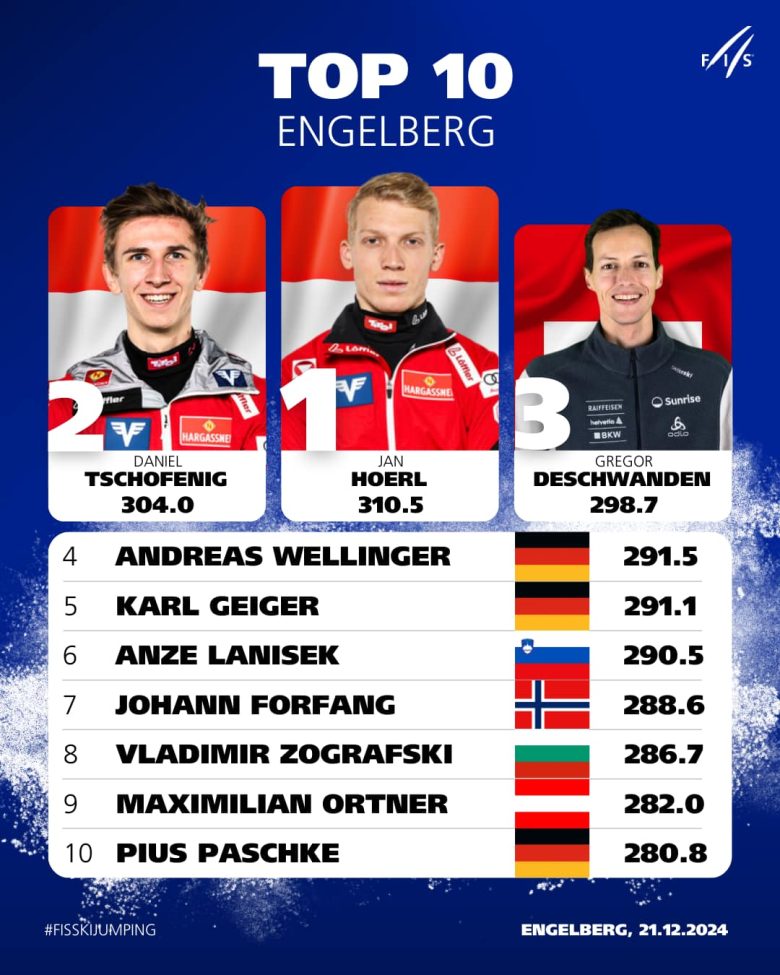 Odigrano je prvo poluvrijeme među skakačima u švicarskom Engelbergu koje je pripalo austrijskom skakaču Janu Hoerlu, a na postolju mu se pridružio i reprezentativni kolega Daniel Tschofenig dok im je na trećem mjestu društvo pravio domaći skakač Gregor Deschwnaden. Sutra se nastavlja natjecanje u svjetskom kupu na istoj skakaonici pa će to biti nova prilika lideru u ukupnom poretku Piusu Paschkeu da malo popravi dojam na generalnoj probi uoči centralnog skakačkog događanja Novogodišnjoj turneji četiri skakaonice od kojih je prva ona u Oberstdorfu u Njemačkoj.