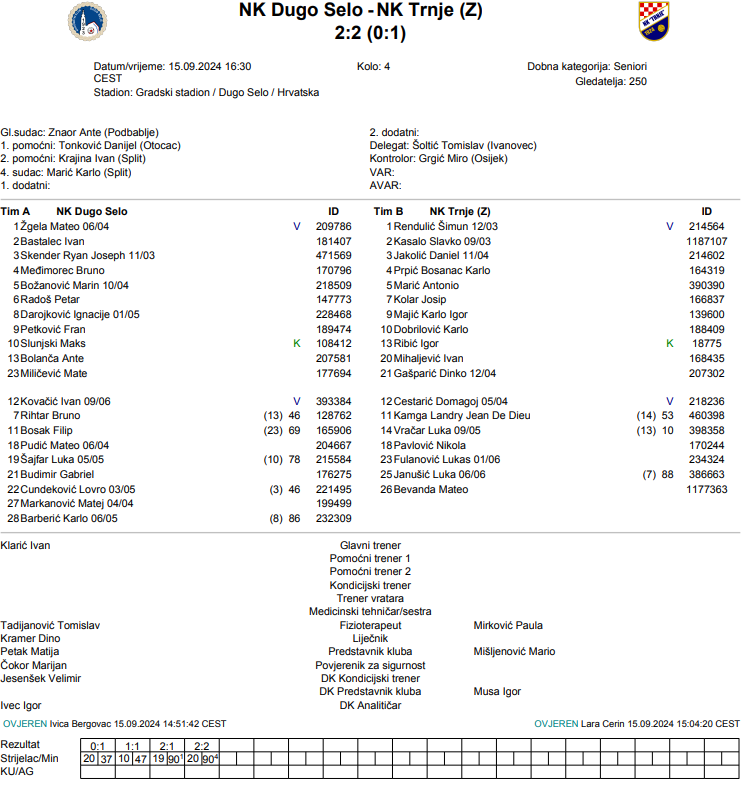Uzbudljivo je bilo u Dugom Selu, na kraju po bod svakom u utakmici koja je imala infarktnu završnicu i za jednu i za drugu klupu. Jedini strijelac u prvom dijelu bio je Ivan Mihaljević koji je donio prednost gostima iz metropole. Sami početak nastavka donio je poravnanje, strijelac za Dugo Selo bio je Maks Slunjski. Nakon toga primirje i zatišje do burnog sudačkog dodatka. U njegovoj prvoj minuti veliko veselje domaćim navijačima donosi Luka Šajfar, činilo se da bodovi ostaju na Gradskom stadionu, no nije tako mislio i najbolji igrač Trnja Ivan Mihaljević, on je u četvrtoj minuti dodatka zabio svoj drugi gol i odnio jedan vrijedan bod u Trnje.