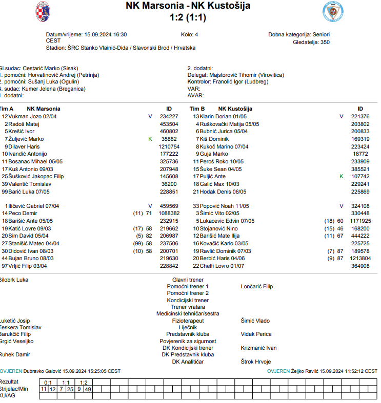 “Koštali su nas loši ulasci u prvo i drugo poluvrijeme, gdje je Kustošija zabila golove, čime je svaki plan pripreme za utakmicu pao u vodu. Uspjeli smo se vratiti na 1:1 i pogodili stativu za 2:1, što bi potpuno preokrenulo rezultat. Nažalost, u drugom poluvremenu opet primamo rani gol, a u tom razdoblju Kustošija nas je mogla potpuno razbiti. Uspjeli smo preživjeti i zadnjih 10 minuta dovesti utakmicu blizu neriješenog rezultata, ali nismo uspjeli. Čestitke Kustošiji na pobjedi, a mi se okrećemo sljedećoj utakmici i novoj neizvjesnosti.” – rekao je trener Marsonije, Luka Bilobrk.