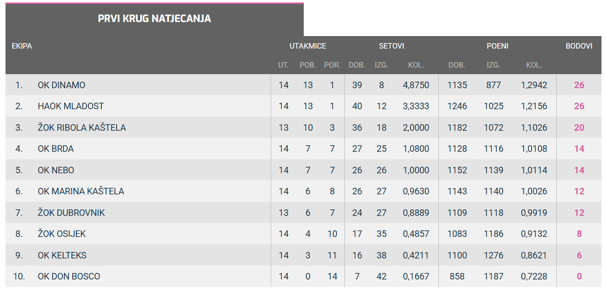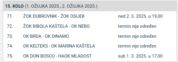 Pred nama je 15. kolo u subotu, 1. ožujka, Don Bosco će na domaćem terenu dočekati vodeću Mladost. Bit će to prilika za zagrebačku ekipu da potvrdi svoju dominaciju i ostane u utrci za prvo mjesto s Dinamom. Dan kasnije, u nedjelju, 2. ožujka, Dubrovnik će ugostiti Osijek, točni termini ostalih susreta još nisu definirani. Tko će zadržati prednost na vrhu, hoće li Ribola Kaštela iskoristiti odgođeni susret za priključak. Može li Don Bosco konačno prekinuti crni niz?