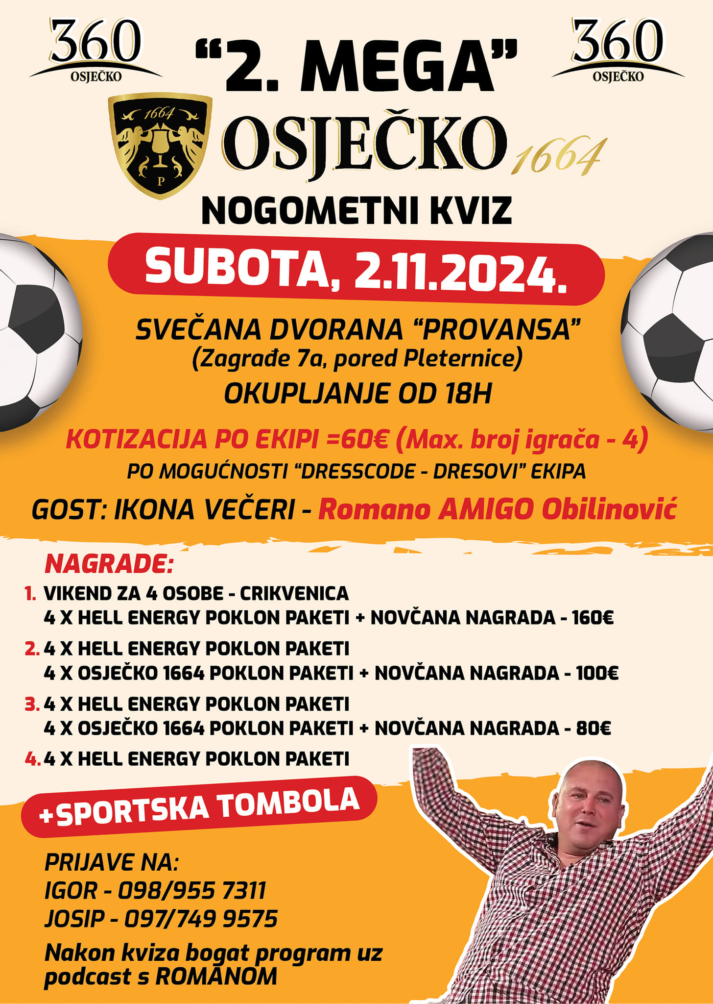 U subotu 2. studenog u Zagrađu prava poslastica za sve ljubitelje kviza i poznavatelje nogometa – 2. Mega nogometni kviz uz Osječko. Protekle 2023. u Zagrađu su odradili “probu” i sami sebe iznenadili sjajnim odazivom i organizacijom koja je oduševila sve sudionike.