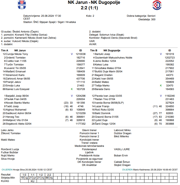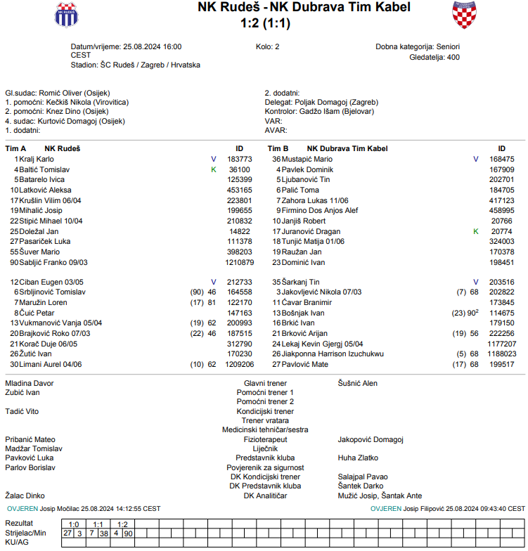 Danas su odigrane posljednje tri utakmice drugog kola Prve NL, dvije u Zagrebu i jedna u Solinu gdje je Croatija domaćin dok se teren u Zmijavcima do kraja ne uredi i ne bude spreman za igru, to bi trebalo biti sredinom rujna. Rudeš je katastrofalno loše krenuo u sezonu, nakon dva kola umjesto šest planiranih bodova, tavori na dnu zajedno sa Zrinskim.