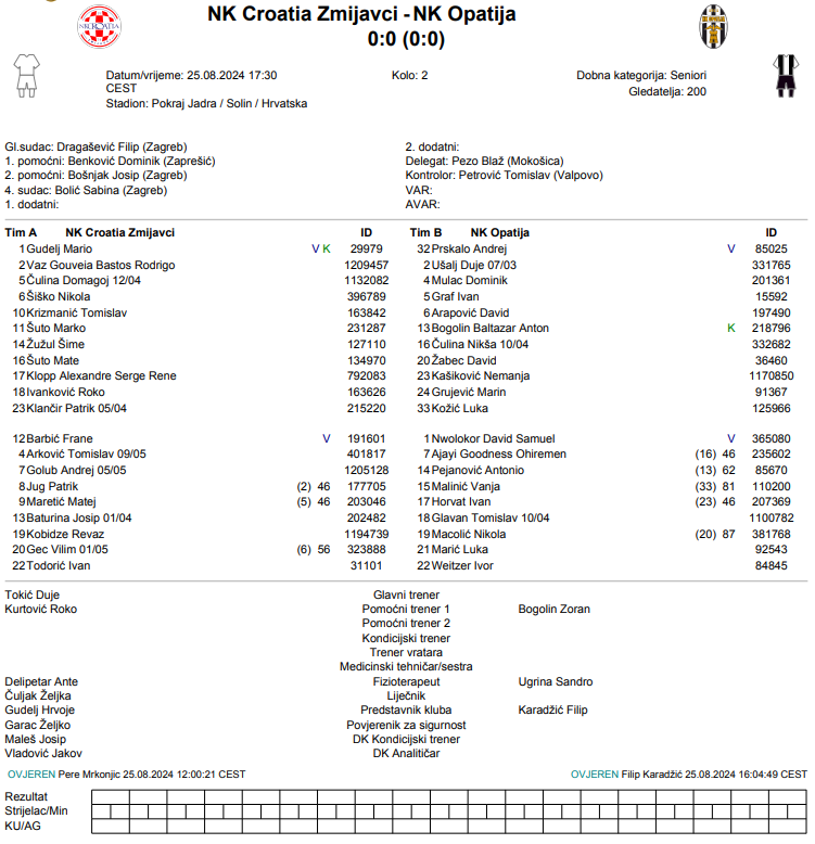 “Imali smo dominaciju u prvom poluvremenu, pogodili smo gredu, sve smo iskontrolirali. U nastavku su oni uvođenjem Pejanovića dobili na toj kontri, no nisu nas uspjeli kazniti, a mi smo od 80. do 90. minute imali tri dobre šanse. Teren je u Solinu loš, ne dozvoljava brzu igru, igrači se muče dok ukrote tu loptu. Opatija se izašla braniti i čekati kontru, nismo ih uspjeli probiti” – izjavio je trener Croatije, Duje Tokić.
